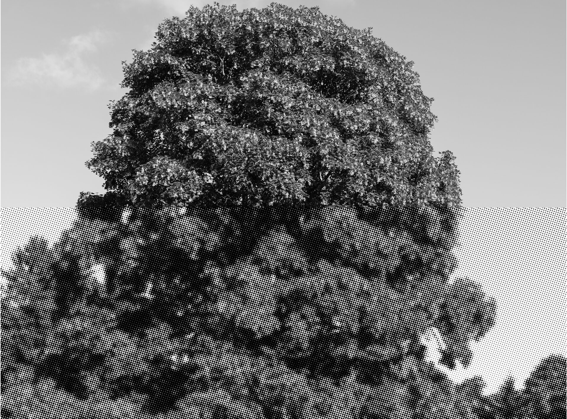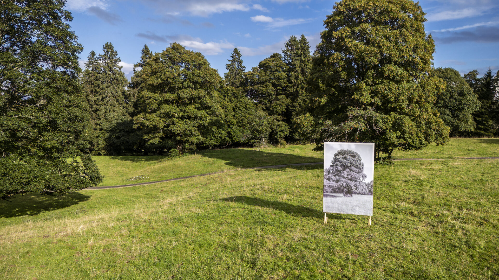 The viewing distance becomes more comfortable, the image itself partially illegible. From a viewing distance of a few meters the image and the tree appear to be the same scale.