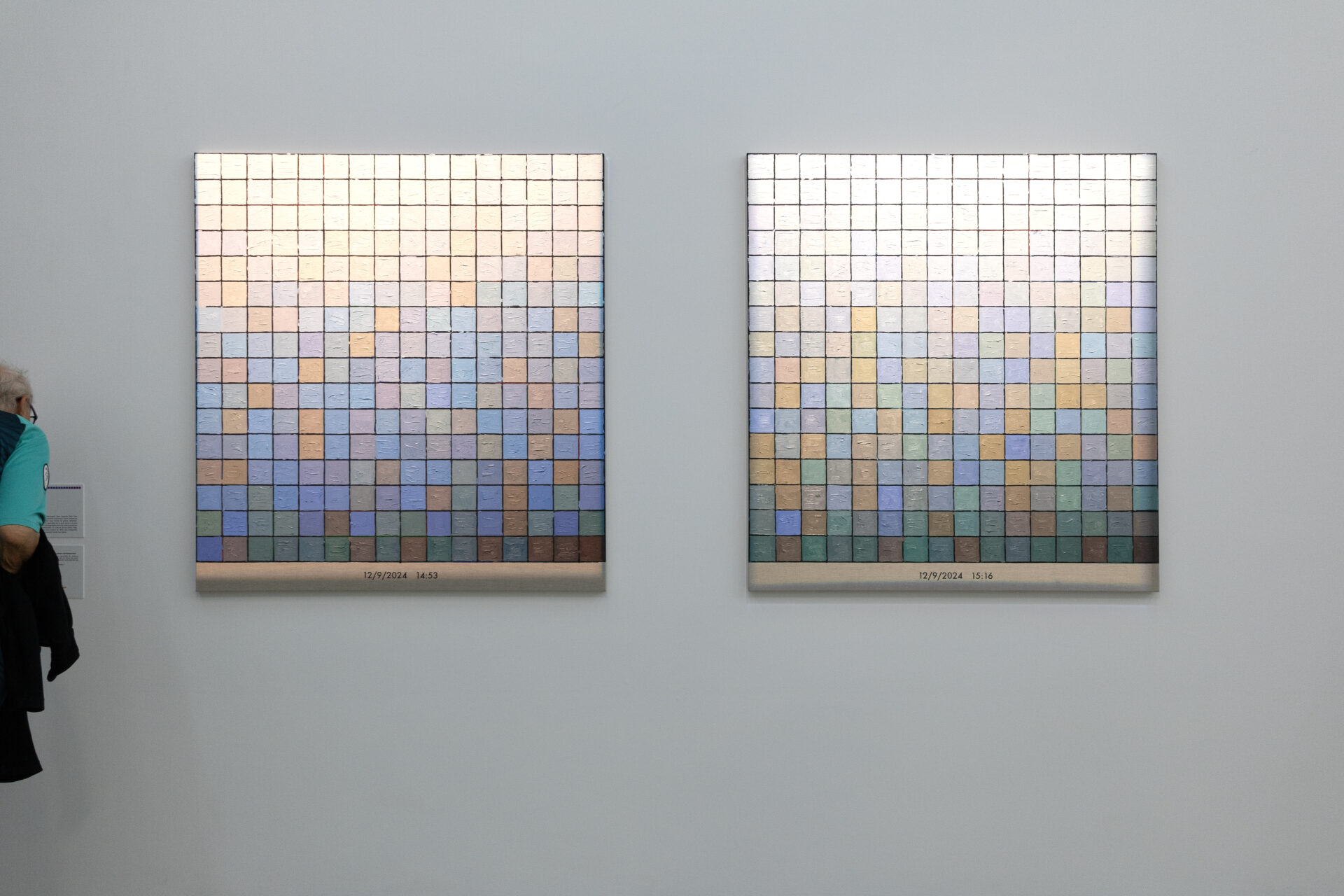 I combined a painting in 2 key colors with all the landscapes with an infinite horizon from the museum’s collection. In addition, I showed 2 daylight works and a fluorescent tube lamp that copied the light from outside with a sensor. on the daylight works, the colors of the sky are listed from left to right in a time bar. One of the two was an ordinary day, the other the birthday of my daughter, where the day normally starts at 0:00h this time bar started at 8:13 so the night falls in the middle of the image.