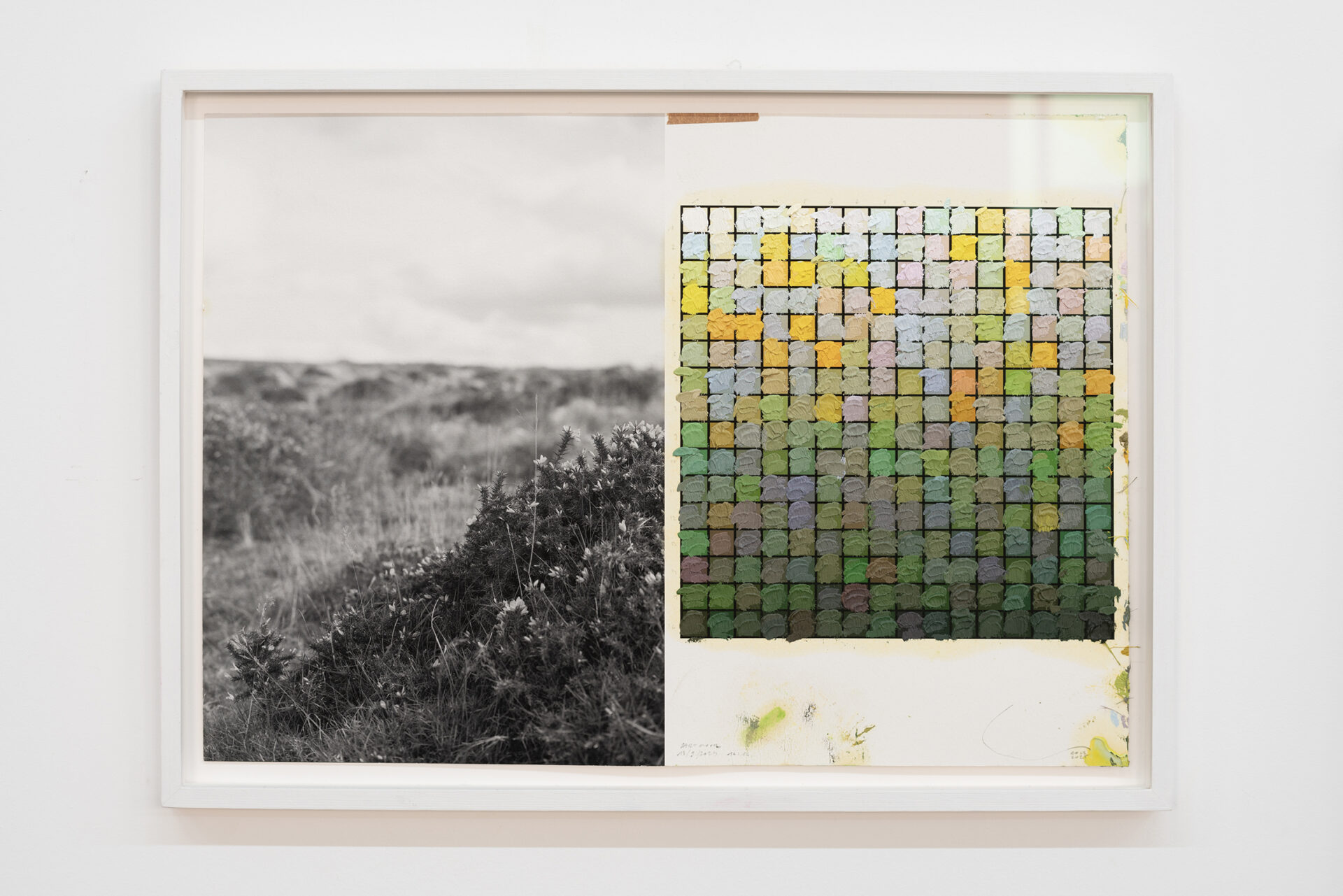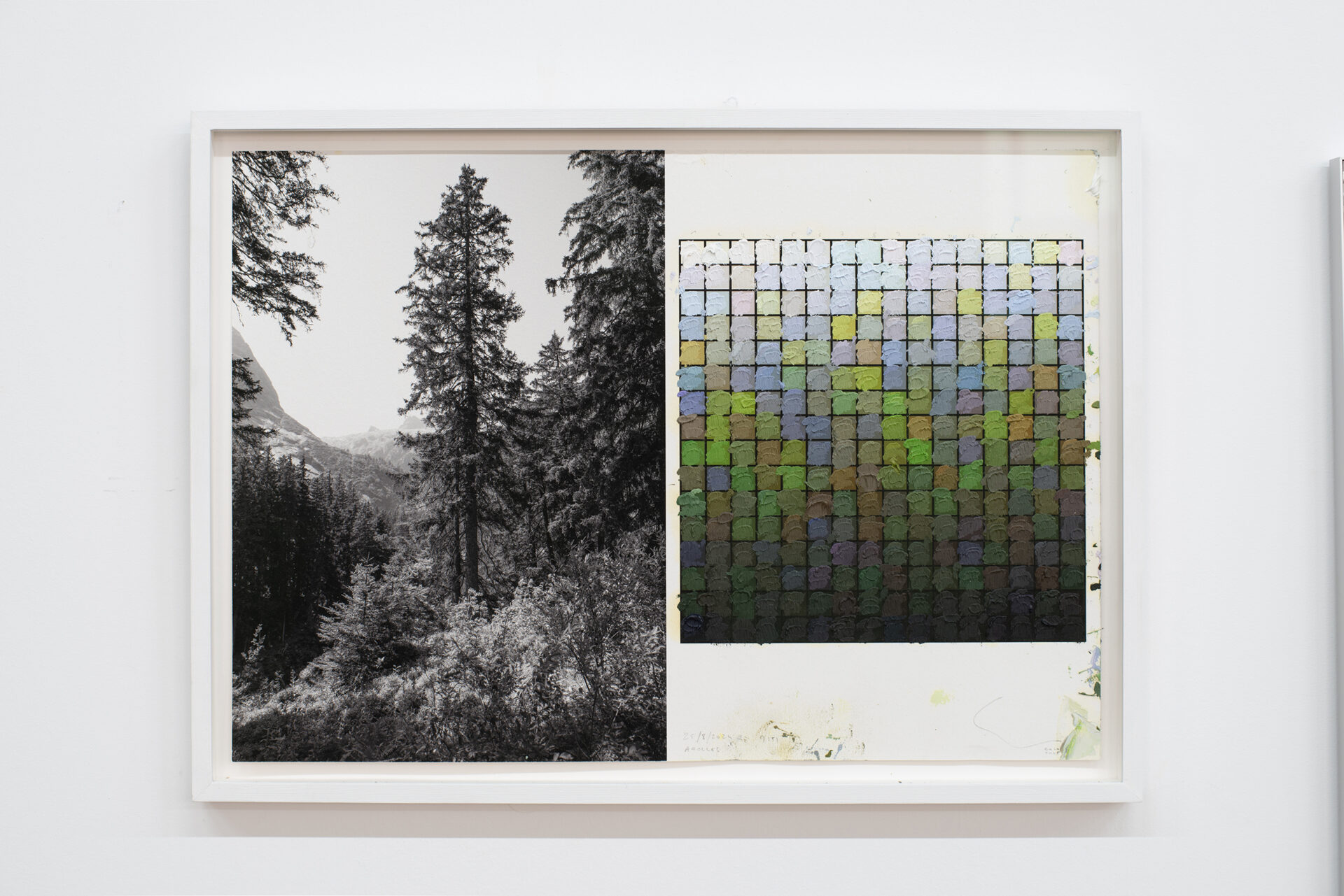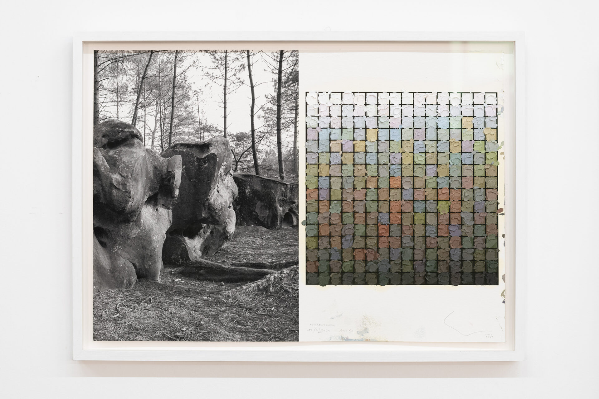 For this work, Cole made a journey from Texel (the Netherlands) to Bialowieza (Poland), a journey from a cultural landscape, the Dutch polders recently reclaimed from the sea, to the only remaining piece of primeval forest in Europe. In the middle of that journey (geographically and mentally), Cole visited a landscape park in Branitz (Germany). In this park, designed by Fürst Pückler Muscau, nature was composed for the first time in function of a visitor on foot. Previously, avenues were created in landscape parks so that people could move from one spectacular view to another by carriage. In Branitz, new views are constantly emerging. Cole made three pairs of photos in which I took two steps sideways in between the images. He converted these images into three times two drawings that were presented with the same spacing as in which the photos were taken (2 steps).