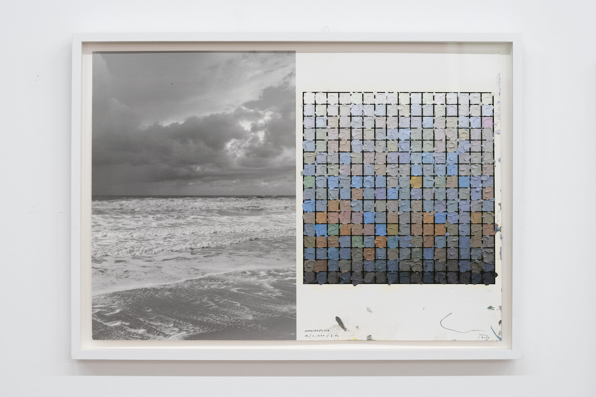 In the “Variations sur les mêmes thèmes” works, Cole uses a limited number of ingredients to create series in which each work is slightly different from the others. On top of a vertical photograph of the sea with the horizon perfectly in the middle, two areas of colour are screen-printed that together make up half of the image. The colours used are the average colours of the sky and the sea. By arranging the surfaces in four different ways, four different compositions are created. The screen-printed areas are printed matt on top of the glossy image.
